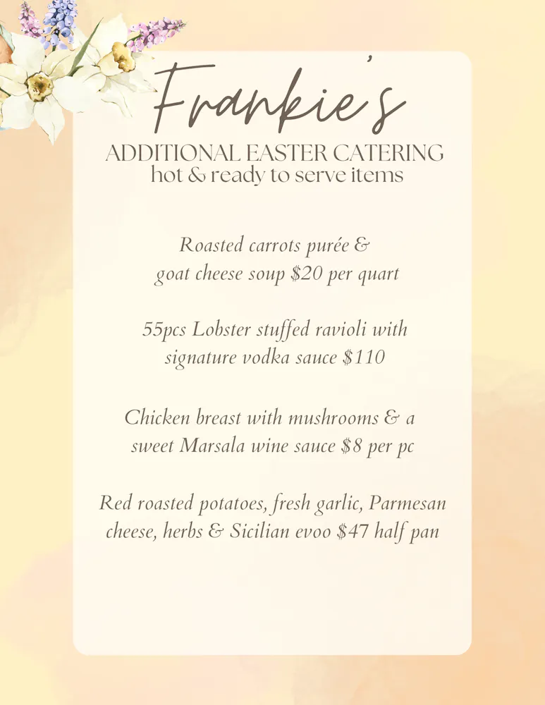 Easter Sunday, April 5 full regular menu + additional items below. Open 11:00am until 3:30pm. **Orders must be called in by 2:30pm Tuesday March 31. Do not fill out online form OR email. Must be called in. We extended the deadline to Tuesday afternoon the latest. Inventory is being finalized. Only pick ups still available 🐰