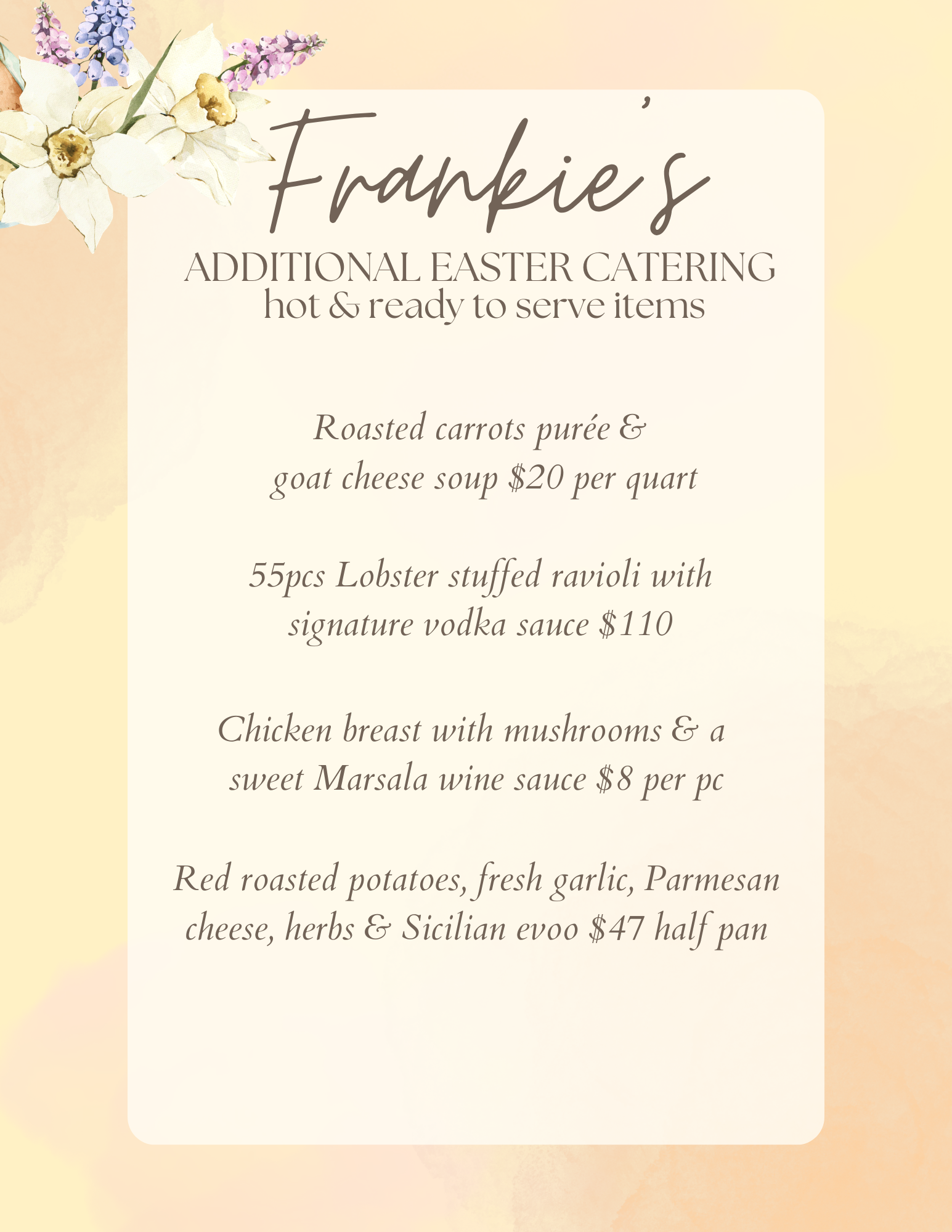 Easter Sunday, April 5 full regular menu + additional items below. Open 11:00am until 3:30pm. **Orders must be called in by 2:30pm Tuesday March 31. Do not fill out online form OR email. Must be called in. We extended the deadline to Tuesday afternoon the latest. Inventory is being finalized. Only pick ups still available 🐰